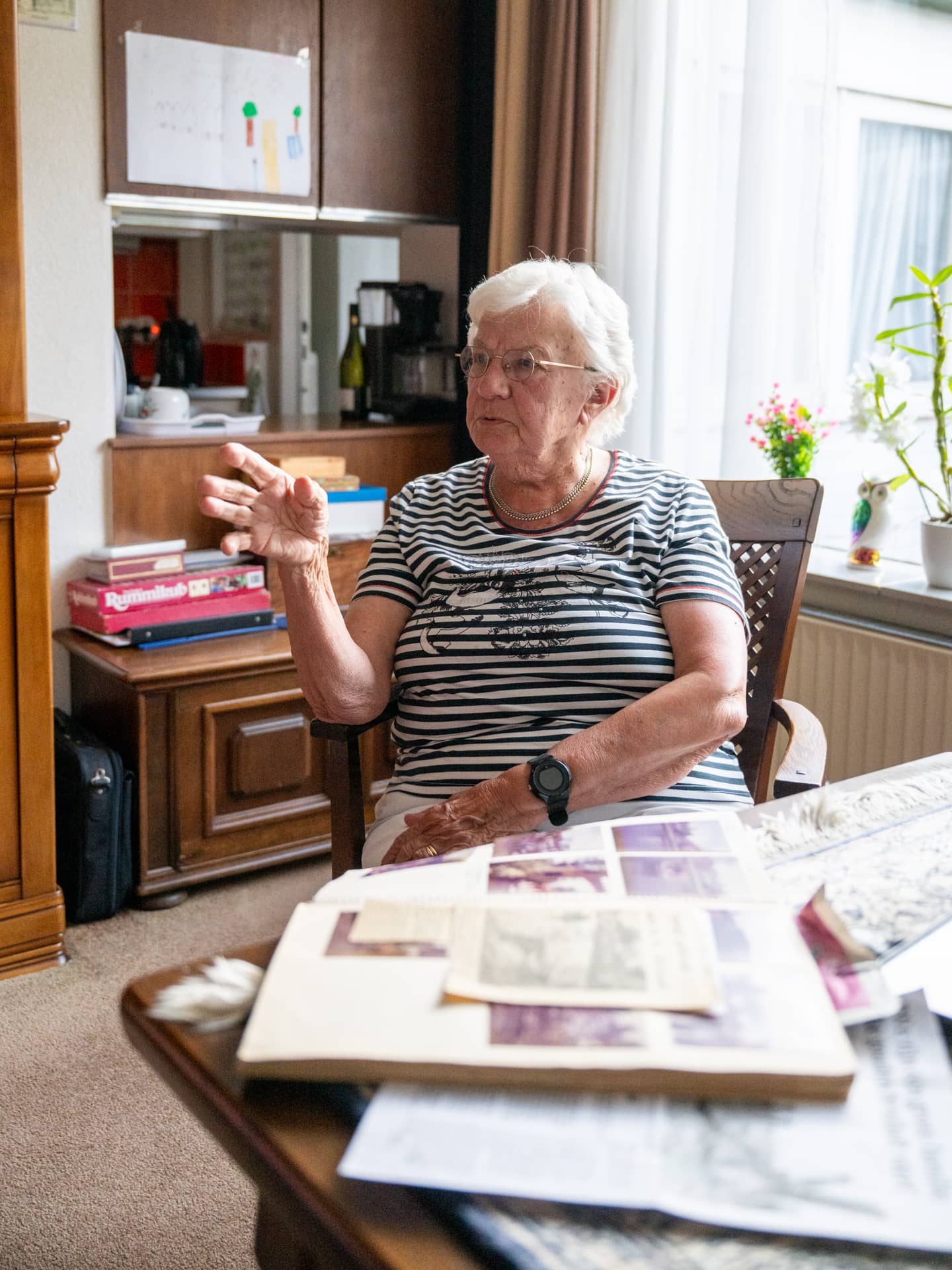 ‘In een buurthuis ergens bij de Singel heb ik tien lessen gevolgd om met de mobiel te leren werken. En ik draag een horloge met een SOS-knop. Als ik daarop druk, wordt een van mijn kinderen gebeld. Ik heb dat een keer per ongeluk gedaan, in mijn slaap. Opeens hoorde ik Walter door de telefoonspeaker: “Mam, wat is er?”’